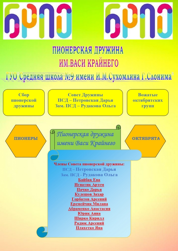 Центральный Совет ОО «БРПО» ![]() Яковицкая Кристина Андреевна, председатель ЦС ОО «БРПО» 230023, г. Гродно, ул. Коложский парк, 1, каб. 100 Тел.: 8 0152 68 50 24 | Гродненский областной Совет ОО «БРПО» ![]() Данилина Екатерина Ромуальдовна, председатель ГрОС ОО «БРПО» 230023, г. Гродно, ул. Коложский парк, 1, каб. 100 Тел.: 8 0152 68 50 24 | Слонимский районный Совет ОО «БРПО» ![]() Горбацевич Инна Николаевна, председатель РС ОО «БРПО» 231800, г. Слоним, ул. Первомайская, 10, каб. 7 Тел.: 8 01562 2 50 76 | Пионерская дружина имени Васи Крайнего ![]() Корней Наталья Сергеевна, старший пионерский вожатый 231800, г. Слоним, ул. Коссовский тракт, д. 76 ГУО «Средняя школа № 9 имени И.М.Сухомлина г.Слонима» |