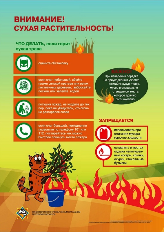 – если очаг небольшой, сбейте пламя связкой прутьев или веток лиственных деревьев, забросайте песком или залейте водой;