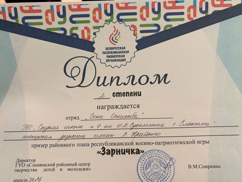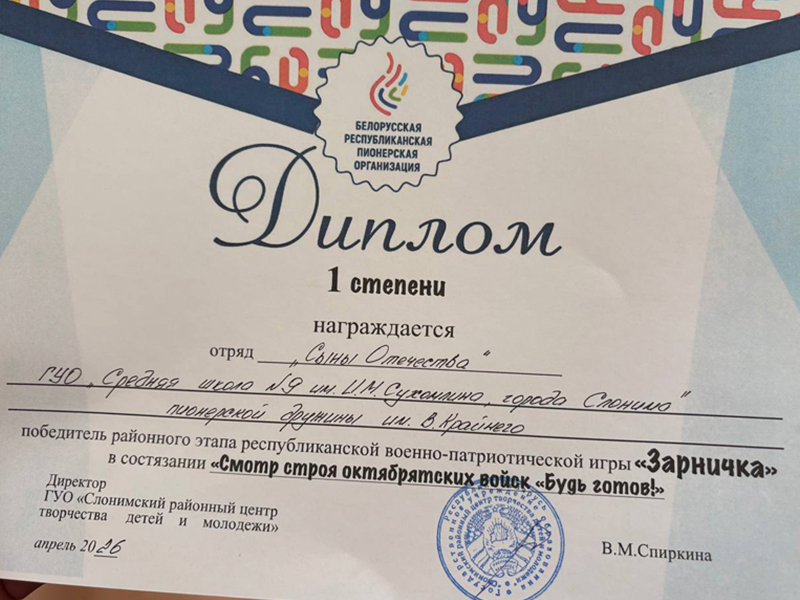 Отряд «Сыны Отечества» ГУО «Средняя школа № 9 имени И.М.Сухомлина г.Слонима» стал призёром районного этапа республиканской военно-патриотической игры «Зарничка» – диплом 2 степени.