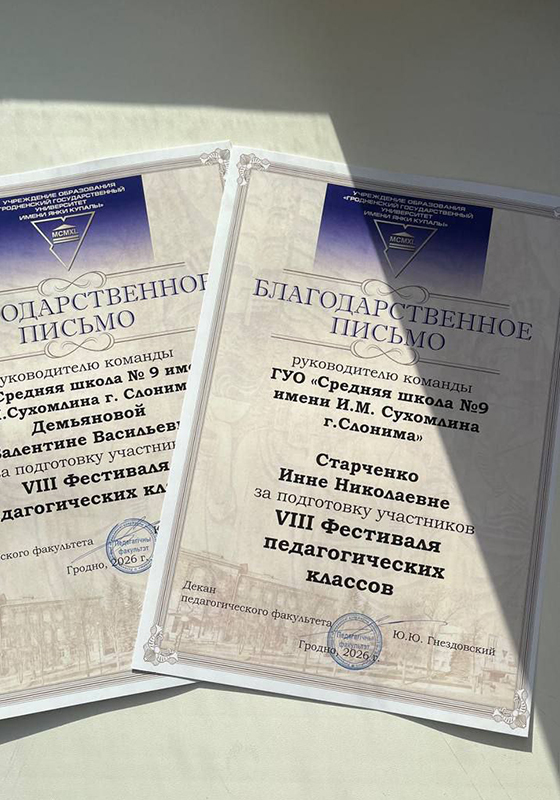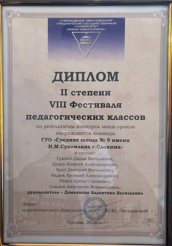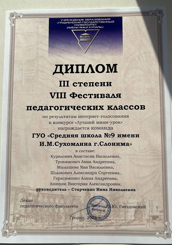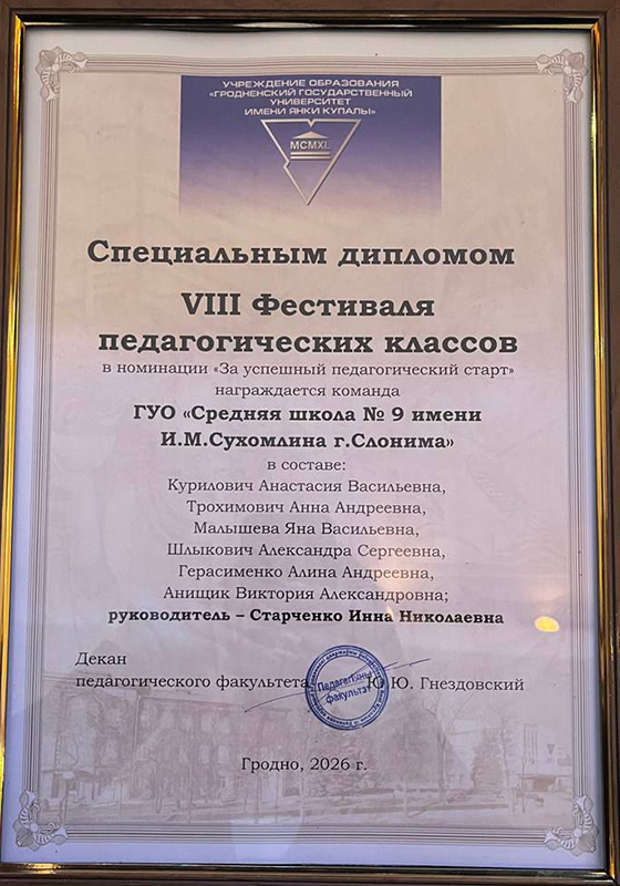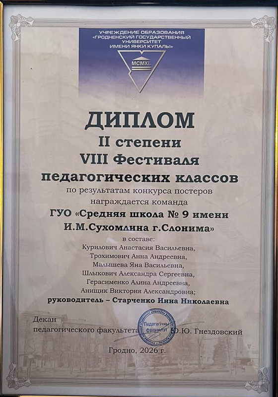 Учащиеся педагогических классов 11А и 10А ГУО «Средняя школа №9 имени И.М.Сухомлина г. Слонима» стали участниками Фестиваля, посетили виртуальную экскурсию по Гродненскому государственному университету имени Янки Купалы, побывали на мастер-классах факультетов. Представили свой яркий творческий номер на сцене Купаловского университета и конечно же были удостоены достойных наград.